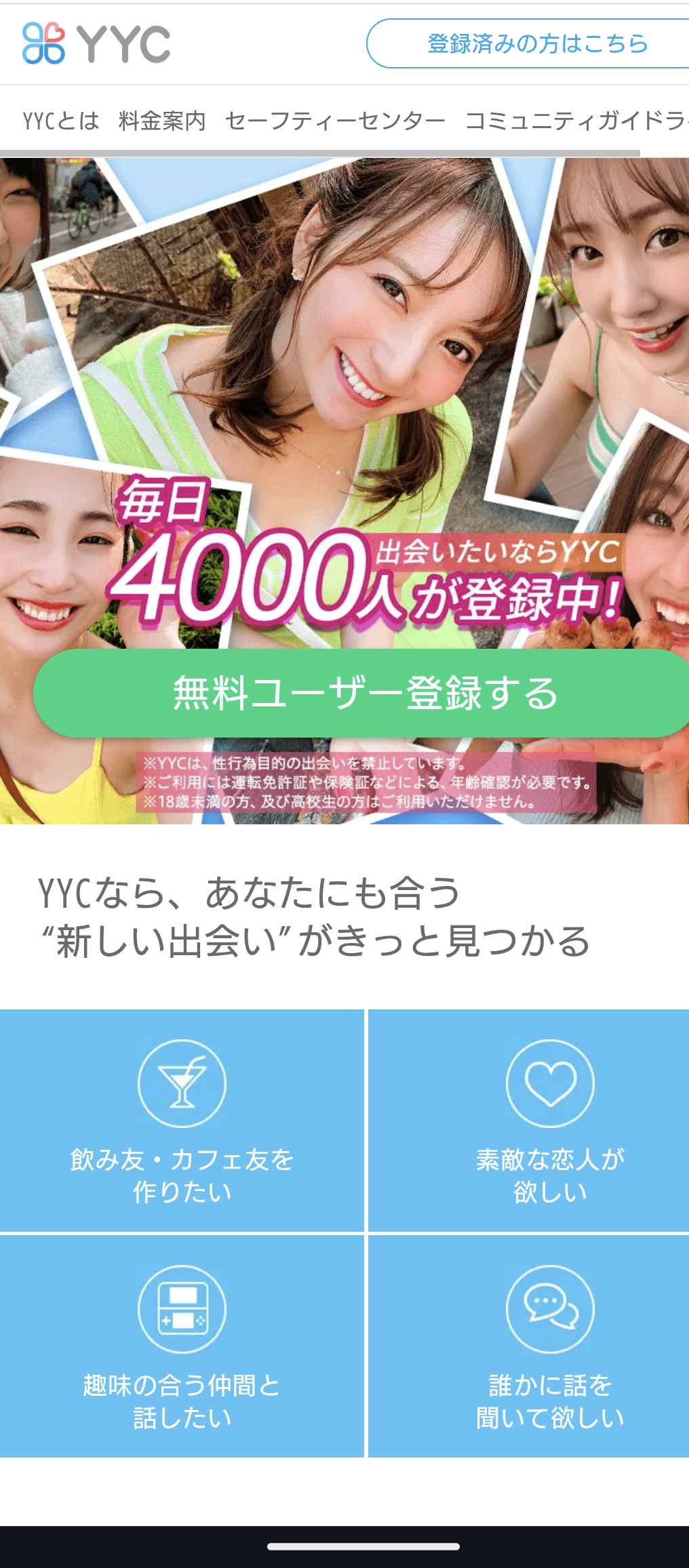 YYCは無料登録で使い始められるので、まずは気軽に試すのがおすすめです。