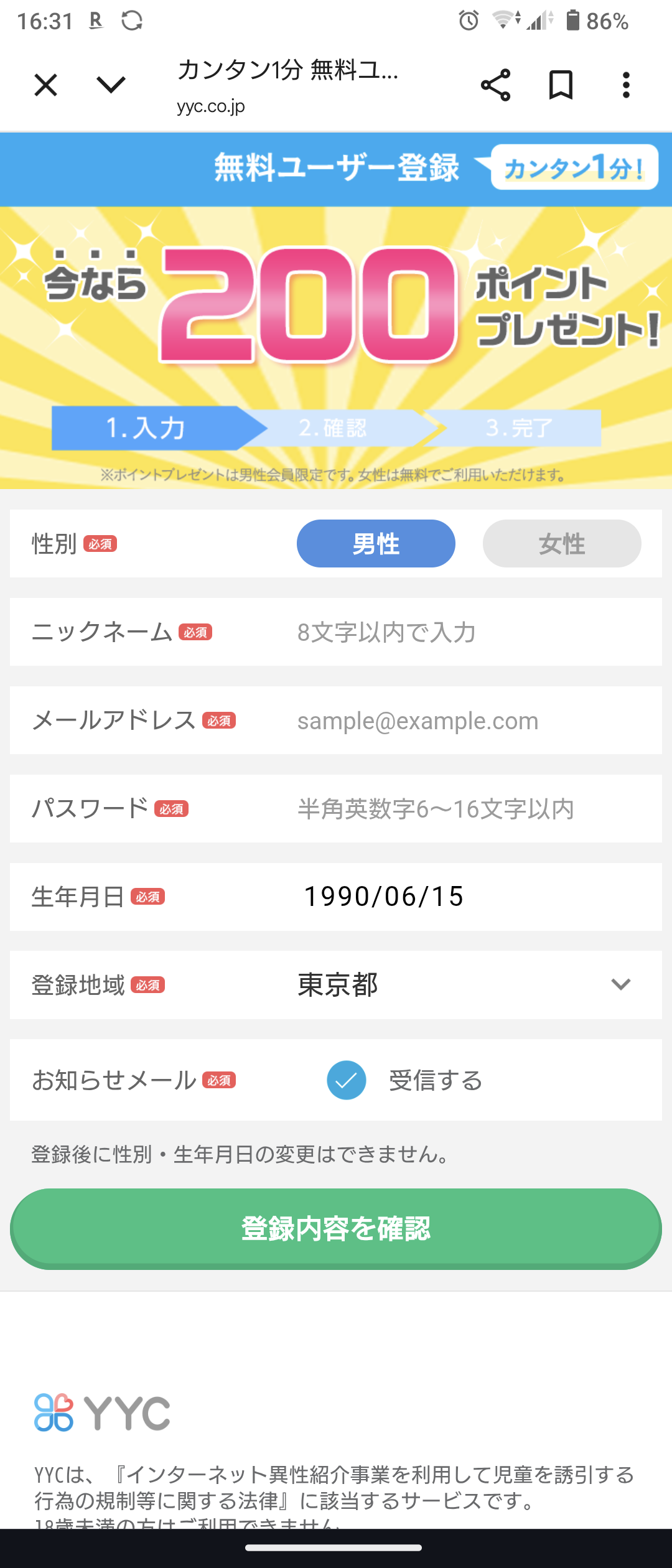 性別、ニックネーム、メールアドレス、パスワード、生年月日、登録地域を入力するだけでOKです。